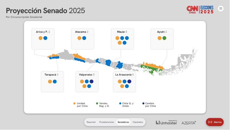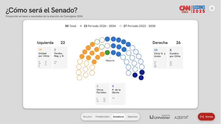 Las estimaciones para la composición del Senado indican que la derecha mantendría la mayoría simple, aunque con un margen más estrecho que en 2021. El bloque opositor sumaría 26 escaños, mientras que la izquierda alcanzaría 22 y las fuerzas Verde–Regionalistas dos. La eventual gobernabilidad del Senado dependerá en buena medida de la coordinación entre Chile Vamos y Republicanos y del rol que asuman los actores regionalistas, cuya presencia se vuelve determinante en votaciones ajustadas.