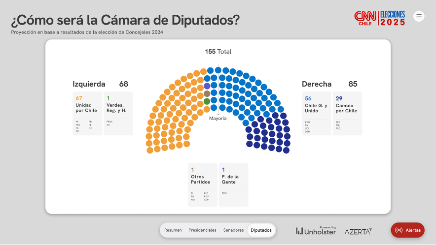 La Cámara de Diputados también muestra un panorama de fortalecimiento opositor, con un crecimiento notable de Republicanos y las corrientes libertarias asociadas a Cambio por Chile. Según las proyecciones basadas en las municipales de 2024, la derecha alcanzaría 85 escaños, mientras que la izquierda llegaría a 68 y el PDG, junto a otros grupos, apenas a dos. Este resultado ubicaría al Congreso de 2025 como uno de los más inclinados hacia la derecha desde 2010, aunque con un nivel de fragmentación que anticipa desafíos importantes para la construcción de acuerdos amplios y estables.