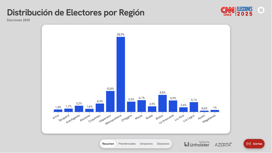 El padrón electoral 2025 asciende a 15.779.102 personas, de las cuales 15,6 millones votarán en Chile y algo más de 160 mil lo harán desde el extranjero. La Región Metropolitana concentra casi cuatro de cada diez electores (38,9 %), equivalente a la suma de Valparaíso, Biobío y Maule juntos. Las tres regiones más pobladas representan el 58 % del total nacional, mientras que Aysén y Magallanes apenas superan el 1,6 %.