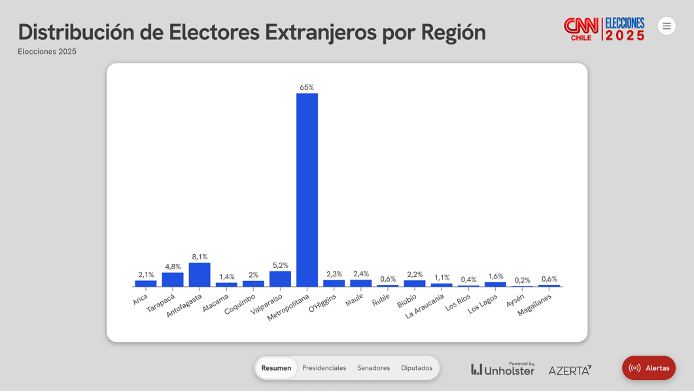 El padrón extranjero casi se duplicó respecto de 2021, llegando a 885.940 electores. La RM concentra el 65 % de este universo, especialmente en comunas densamente pobladas como Santiago, Independencia y Estación Central. El norte minero —encabezado por Antofagasta— constituye el segundo polo de votantes extranjeros.