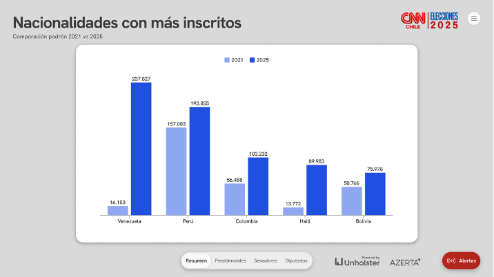 Las nacionalidades predominantes son Venezuela, Perú, Colombia, Haití y Bolivia, con crecimientos notables desde 2017. Aunque su peso agregado no altera resultados nacionales, sí puede influir en comunas o distritos donde los márgenes de competencia son estrechos, especialmente en la RM y el norte.