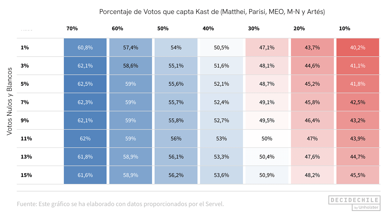 Entonces, si el porcentaje de nulos y blancos es un 3% y Kast obtiene el 60% de los votos de los 5 candidatos, obtendría en la segunda vuelta el 58,6% de los votos. Si, en cambio, solo asegura el 30% de los votos de los 5 candidatos, obtendría el 48,1% y no sería presidente.