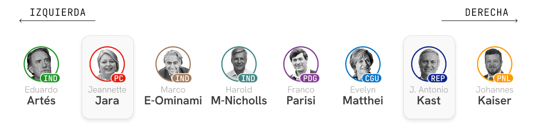 Ordenados en la escala izquierda derecha, el candidato más a la derecha fue J. Kaiser, mientras que el candidato más a la izquierda fue E. Artés. Kaiser tuvo un efecto de moderar la posición ideológica de Kast, mientras que Artés no tuvo ese efecto en Jara.