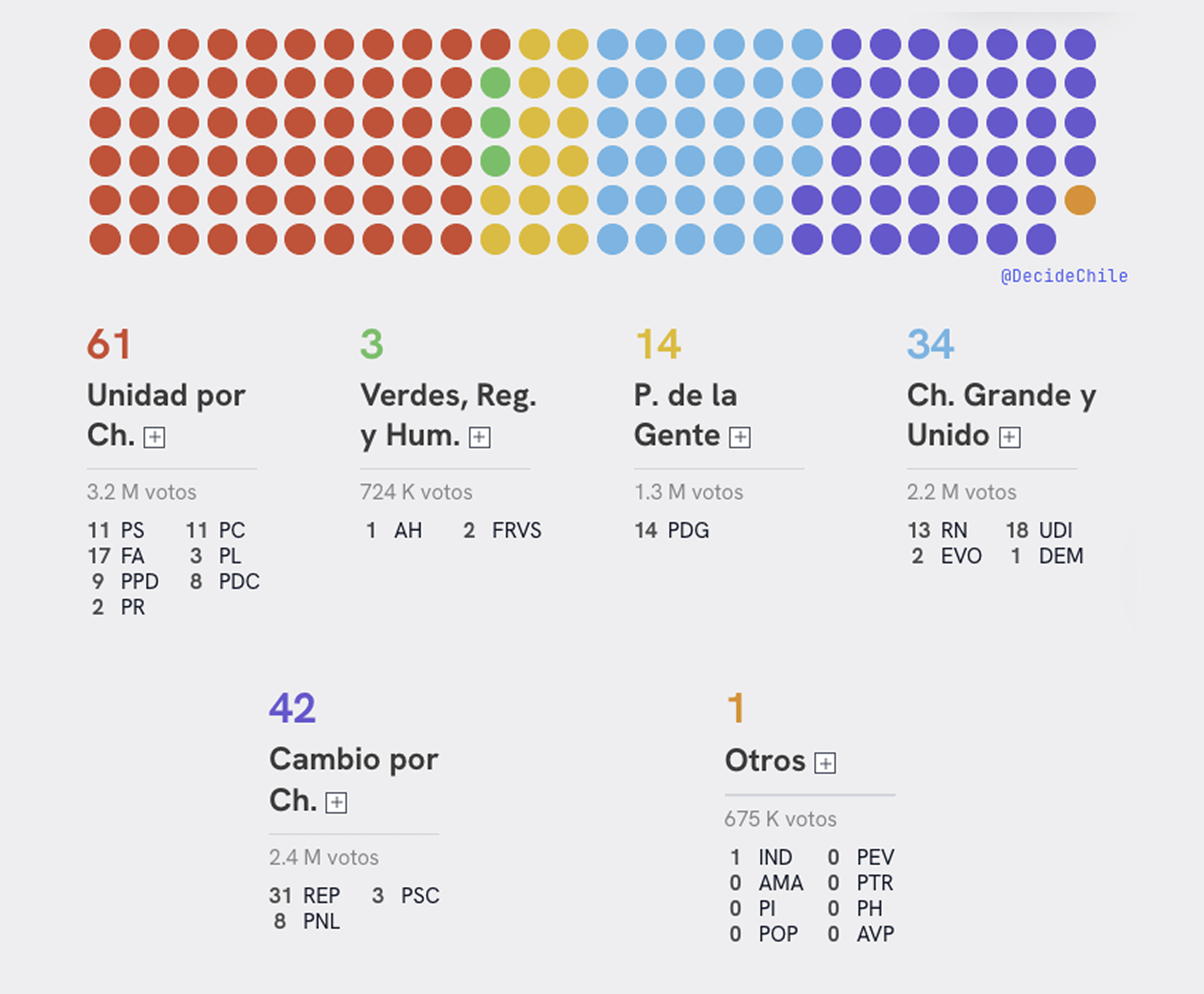 El pacto más grande fue Unidad por Chile con 61 diputados, seguido por Cambio por Chile con 42 diputados. Chile Grande y Unido se quedó con 34 escaños. El Partido de la Gente sorprendió con 14 diputados electos.