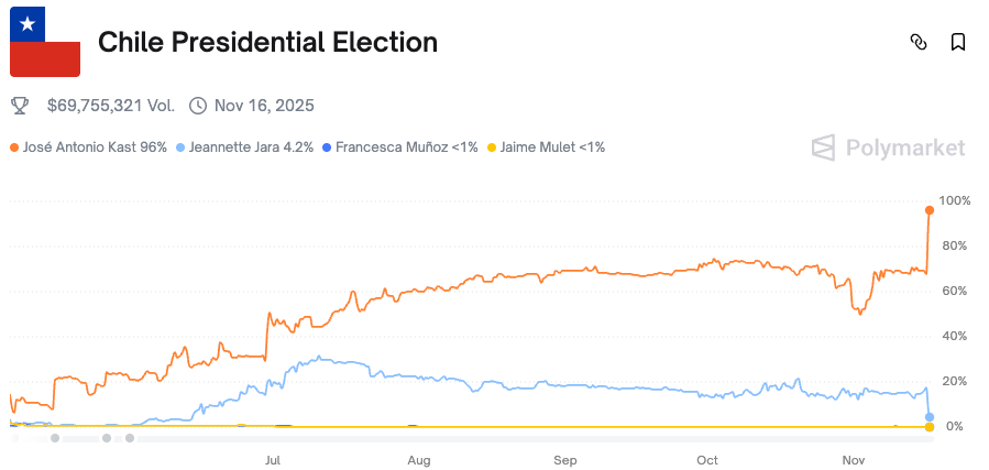 El mercado de predicción estadounidense, Polymarket, marcaba en la mañana del 16 de noviembre que J.A. Kast ganaba las elecciones presidenciales con un 68%. Los recursos transados eran de US$ 68 millones.