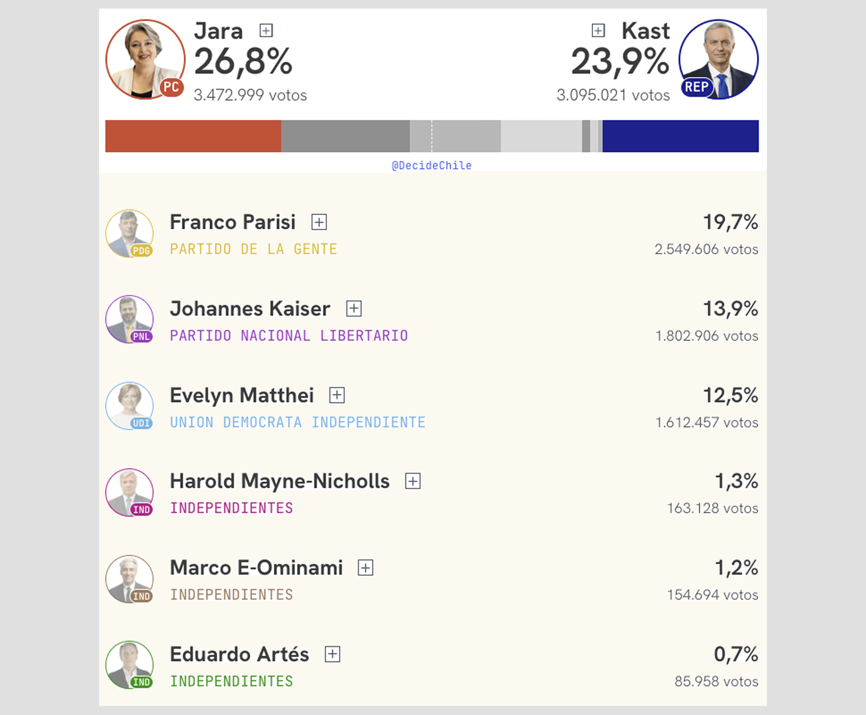 Los candidatos Jeannette Jara, con el 26,8% y José Antonio Kast, con el 23,9% de los votos, disputarán la segunda vuelta presidencial el 14 de diciembre. Quedó en tercer lugar, sorpresivamente, Franco Parisi, 19,7%, a 546.620 votos de J.A. Kast. Los tres candidatos de derecha: Kast, Kaiser y Matthei, sumaron el 50,4% de los votos de primera vuelta, el porcentaje más alto desde la elección de 1946.