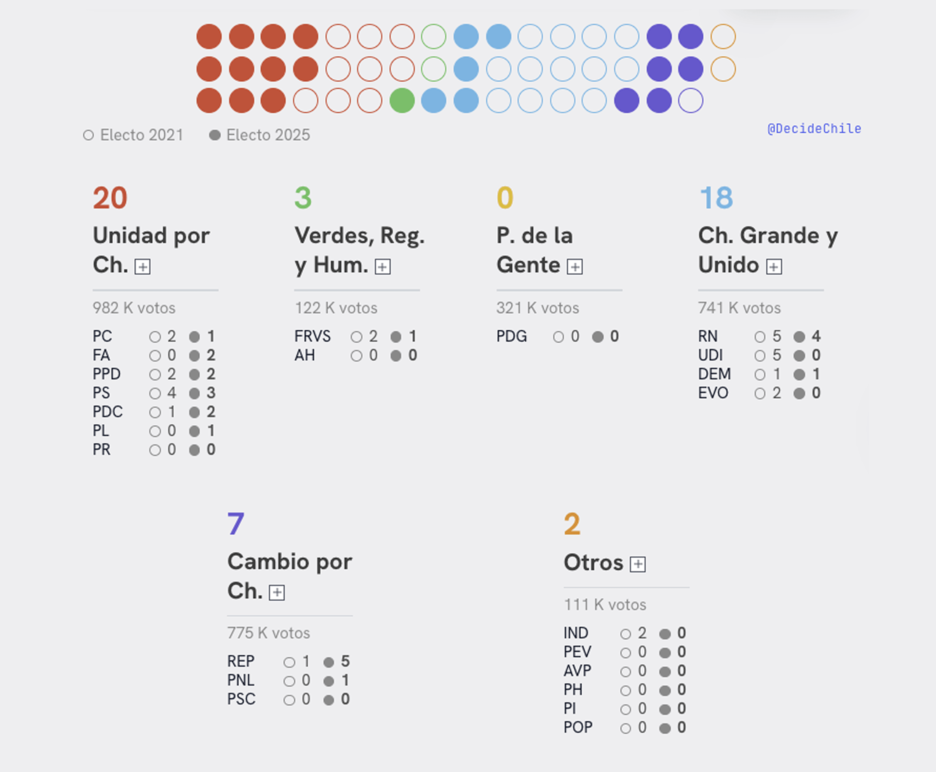 Con esta elección la bancada más grande en el senado es del partido RN, con 9 senadores, seguido por el partido Socialista con 7, Republicanos con 6 y la UDI con 5. La derecha quedó así con 25 senadores y el oficialismo con 23.