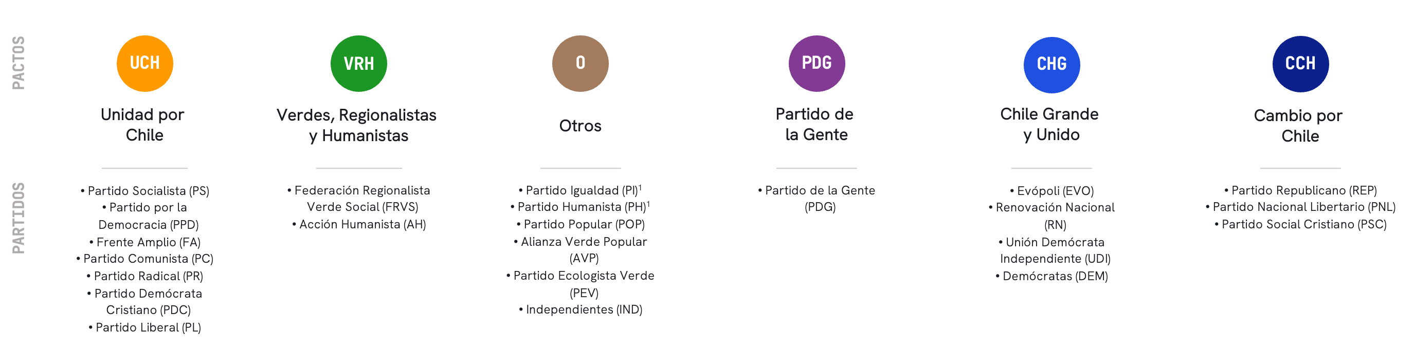 En la elección parlamentaria del 2025, hubo un total de 5 pactos, siendo los 4 principales: Unidad por Chile, Verdes, Regionalistas y Humanistas, Chile Grande y Unido y Cambio por Chile.